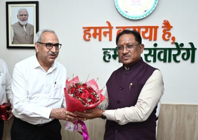 रायपुर 6 अगस्त 2025/ मुख्यमंत्री श्री विष्णु देव साय से आज राजधानी रायपुर स्थित मुख्यमंत्री निवास कार्यालय में भिलाई स्टील प्लांट के नवनियुक्त निदेशक श्री चित्त रंजन महापात्र ने सौजन्य मुलाकात की। इस अवसर पर श्री महापात्र ने मुख्यमंत्री श्री साय को पुष्पगुच्छ, शॉल और श्रीफल भेंट कर सम्मानित किया। मुख्यमंत्री ने श्री महापात्र को उनकी नवीन पदस्थापना पर हार्दिक बधाई एवं शुभकामनाएँ दीं।