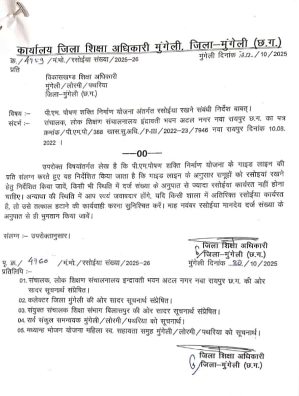 मंगलवार को मध्यान्ह भोजन रसोईया संघ जिला मुंगेली छत्तीसगढ़ संबद्ध भारतीय मजदूर संघ महामंत्री श्री राजेंद्र मांडले ने बताया कि शासन प्रशासन द्वारा आदेश जारी किया गया है कि जिला शिक्षा अधिकारी मुंगेली द्वारा रसोईया रखने के संबंध में सभी विकासखंड शिक्षा अधिकारी को आदेश जारी किया गया है कि पी.एम. पोषण शक्ति निर्माण योजना के गाइड लाइन के अनुसार समूहों को रसोईया रखने हेतु निर्देशित किया जाए करके तत्काल हटाने की कार्यवाही करना सुनिश्चित करे। ऐसा आदेश जारी किया गया है ।जिसका संदर्भ संचालक लोक शिक्षा संचनालय इंद्रावती भवन अटल नगर नवा रायपुर दिनांक 10/08/2022 है । तीन वर्ष पूर्व संचालन से जारी आदेश को आधार मान कर आज रसोईया के विरुद्ध अचानक से आदेश जारी किया गया है । जो कि कम दर पर काम करने वाले रसोईया के पेट में लात मारने जैसा कृत्य है। जिला शिक्षा अधिकारी तीन वर्षों तक आदेश की कापी को रखकर कुभकरणीय निद्रा में सोया हुआ था और अचानक से जाग कर रसोईया के अहित करने के लिए यह आदेश जारी किया गया है। इस आदेश से सभी रसोईया में रोष व्याप्त है और सभी हड़बड़ा गए हैं।