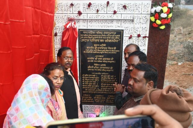 रामानुजगंज के विकास की दिशा में एक ऐतिहासिक अध्याय जोड़ते हुए, कैबिनेट मंत्री श्री रामविचार नेताम ने रामानुजगंज में नवनिर्मित श्अटल परिसरश् का फीता काटकर शुभारंभ किया। इस अवसर पर उन्होंने परिसर में स्थापित भारत रत्न पूर्व प्रधानमंत्री अटल बिहारी वाजपेयी जी की अष्टधातु प्रतिमा का अनावरण भी किया। कार्यक्रम में पूर्व जिला पंचायत अध्यक्ष श्रीमती पुष्पा नेताम विशेष रूप से उपस्थित रहीं। स्कूली बच्चों द्वारा प्रस्तुत सुमधुर स्वागत गीत ‘सांसों की सरगम गाए… सुस्वागतम‘ के साथ कार्यक्रम का आगाज हुआ।